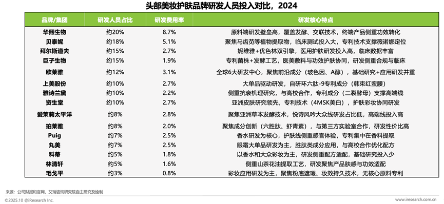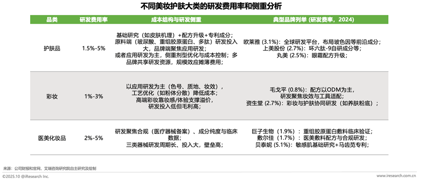 护肤品大类的研发费率介于1.5%-5%,典型企业如上美股份~2.7%的研发投入,聚焦环六肽-9等底层技术等研发投入和创新。彩妆大类的研发费率1%-3%,毛戈平0.8%的低费率源于妆效适配等应用研发;医美赛道2%-5%的费率则聚焦合规与临床数据,形成差异化研发投入格局。