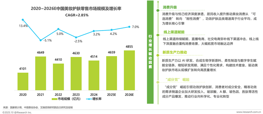 按社会零售额对限额以上化妆品单位统计,2025年国内化妆品市场零售额预计达4,700亿。按中国香妆协会更宽泛的全渠道交易额口径统计,市场规模预计达1.1万亿。无论哪一种统计口径,我国的美妆护肤行业已然进入万亿级的市场队列,国货品牌的市场份额上也已占据半边天。这一行业要实现高质量发展,核心驱动力之一也离不开新质生产力的培育与落地。