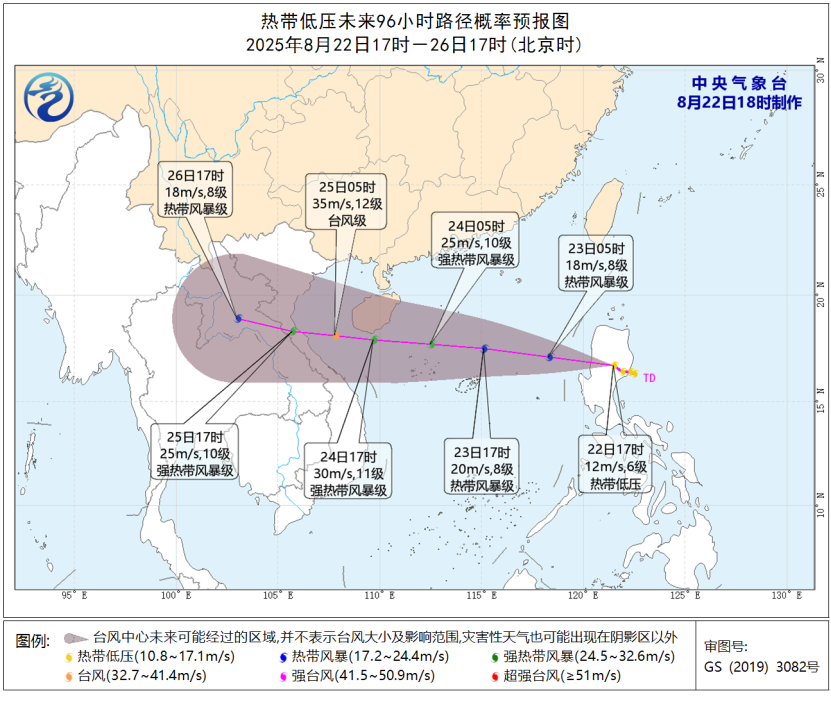 不过,今天上午海上又一个热带低压生成。预计,该热带低压将以每小时25~30公里的速度向偏西方向移动,穿过菲律宾吕宋岛后,于今天夜间进入南海东部海域,强度逐渐加强,将在24小时内发展为今年第13号台风。